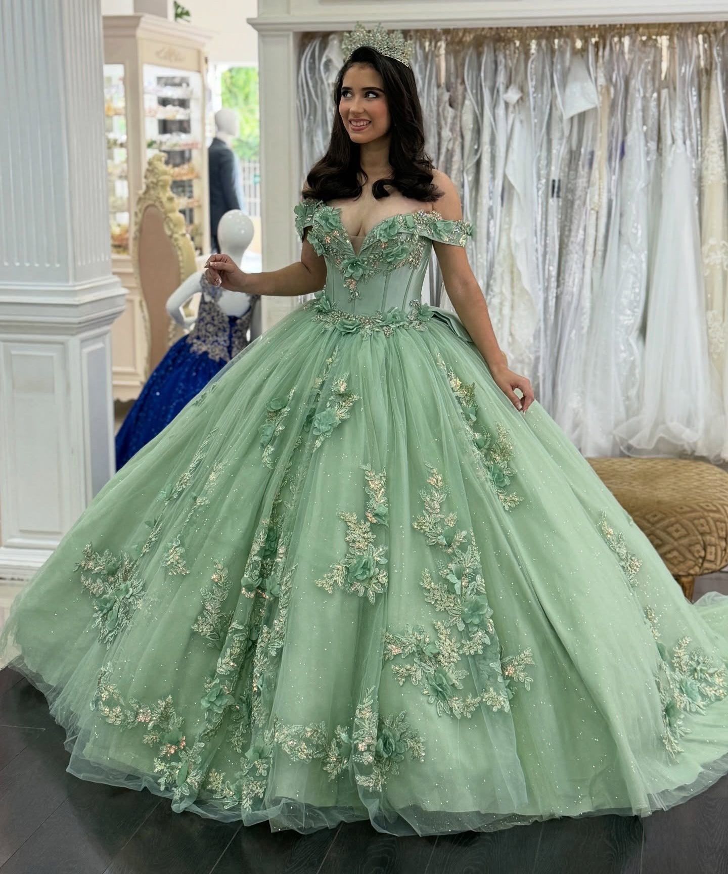 Glittery Tulle Appliqued Beaded Green Sweet 15 Quinceanera Dresses with Big Bow