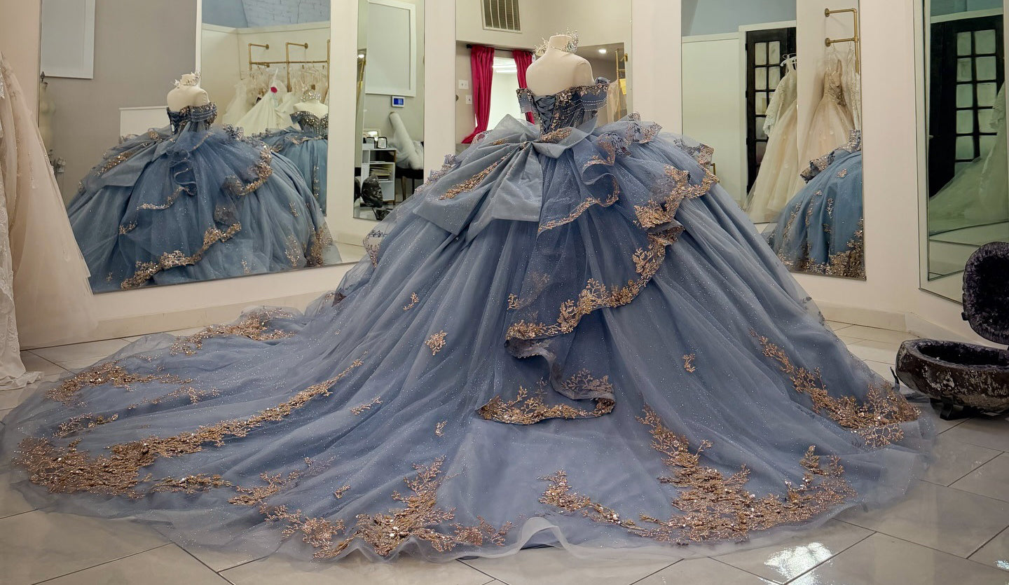 Description:The HE1212 tulle quinceanera dress with ball gown shape and features off shoulder design,adorned with lace sequin and beaded .Perfect for sweet train birthday parties or quinceaneras. Don't settle for ordinary, stand out in this stunning piece.