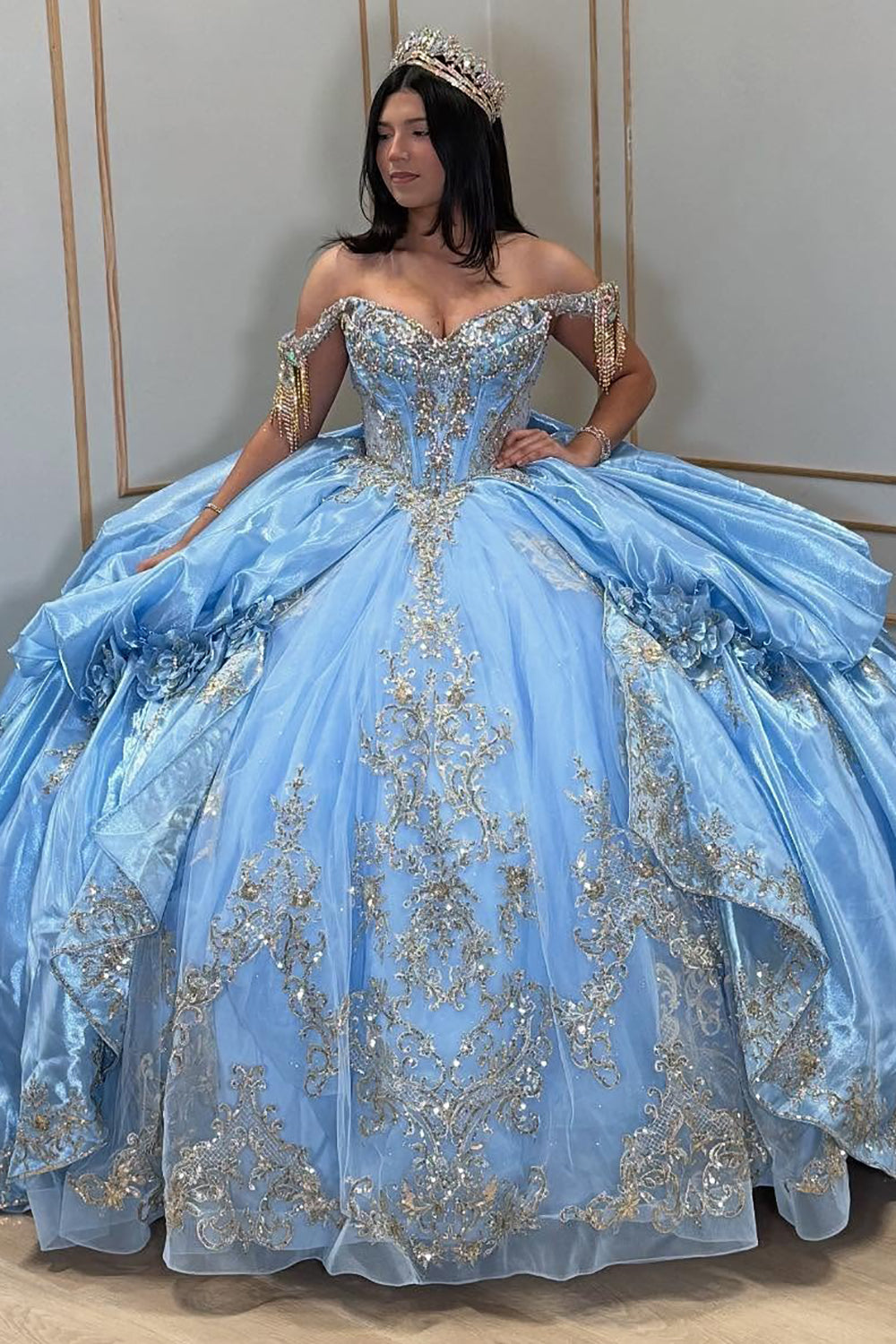 Princess Ball Gown Tulle Lace Beaded Sweet 16 Blue Quinceanera Dresses