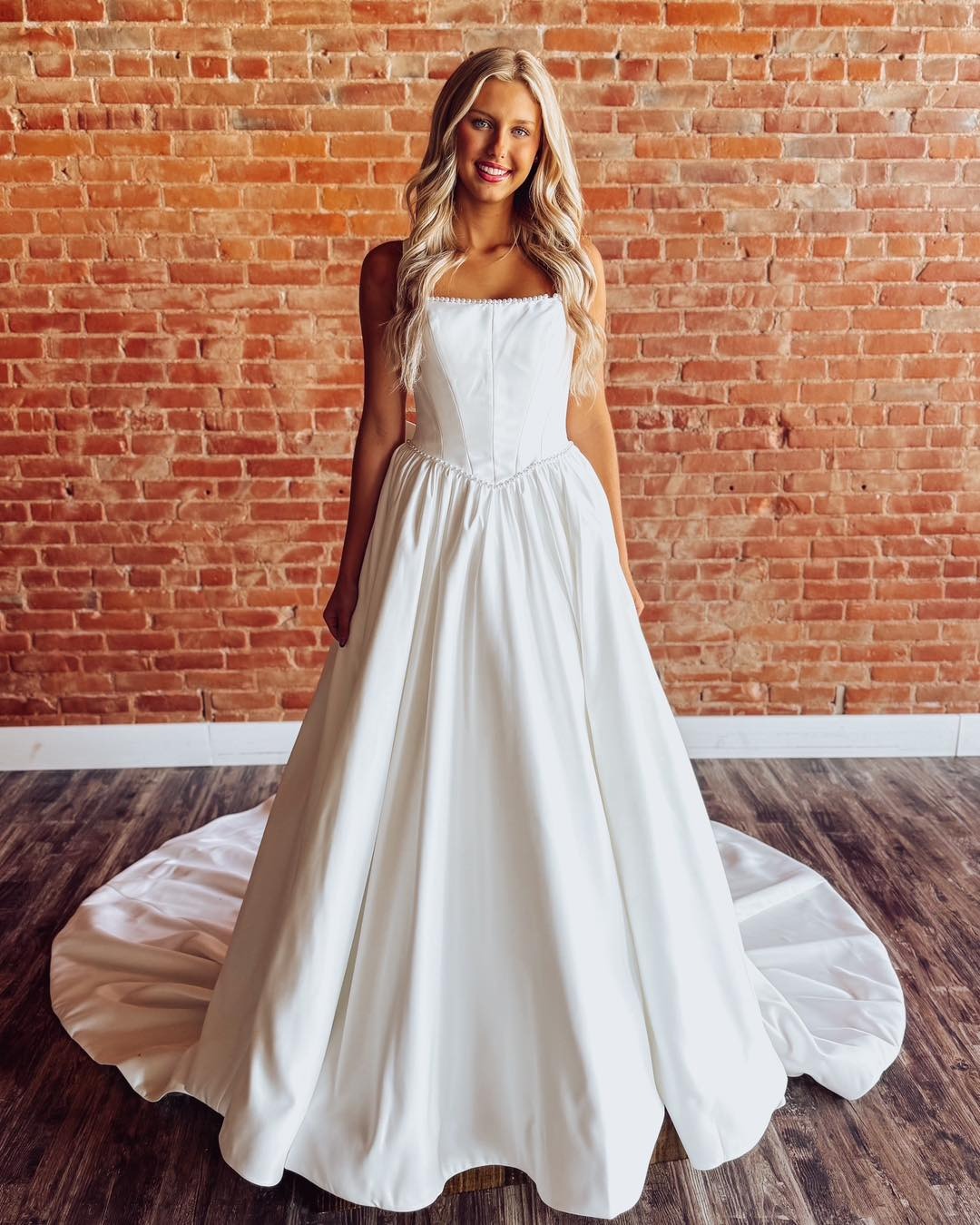 Satin A Line Wedding Dresses Crystal Strapless Corset Wedding Gowns for Women