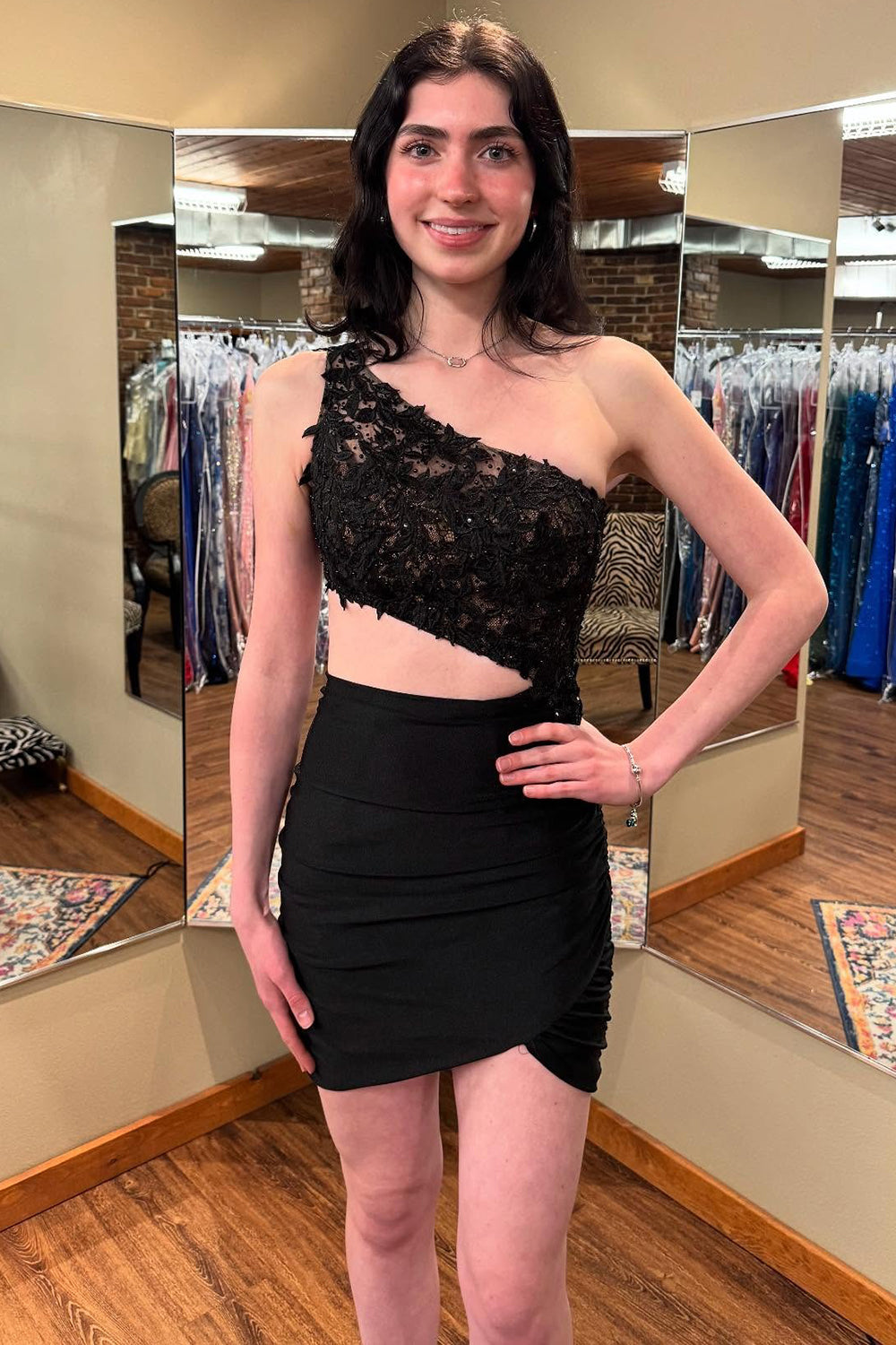 Sheath One Shoulder Chiffon Lace Appliqued Homecoming Dresses for Juniors